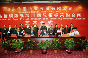 6月17日,華泰紙業(yè)45萬噸高檔銅版紙項(xiàng)目國(guó)際招標(biāo)采購合同簽字儀式在華泰工業(yè)園舉行。東營(yíng)市市委常委、廣饒縣縣委書記趙豪志,縣長(zhǎng)田和友,市經(jīng)貿(mào)委副主任龍艦,縣委常委、大王鎮(zhèn)黨委書記楊同賢等政府領(lǐng)導(dǎo),集團(tuán)董事長(zhǎng)李建華,以及中標(biāo)單位美卓造紙與紙漿總裁Bertel、安德里茲亞洲區(qū)副總裁Gary、ABB亞太區(qū)域銷售經(jīng)理Jean—christophe bussolaro、長(zhǎng)沙長(zhǎng)泰輸送包裝設(shè)備有限公司總經(jīng)理簡(jiǎn)澤豐等出席簽字儀式。儀式由山東齊信招標(biāo)公司趙欽軍經(jīng)理主持。