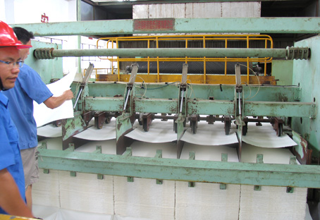 圖為正常生產(chǎn)中的賀紙漿板車間