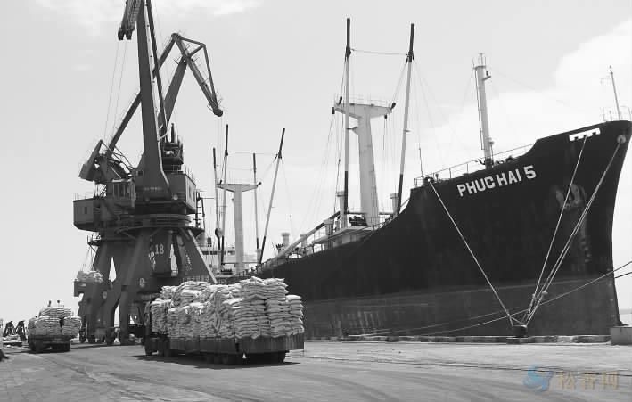 9月16日,在欽州港散貨碼頭,工人正在吊裝化肥上船。
