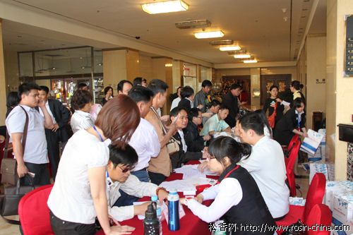5月10日是“2010中國松香市場信息交流暨貿(mào)易洽談會”報(bào)到的日子,早上8:30分負(fù)責(zé)會議簽到的工作人員整裝就位,等待國內(nèi)外參會代表的到來。截止目前,印度,法國,英國的國外客戶已經(jīng)到達(dá)會議酒店,國內(nèi)參會企業(yè)陸續(xù)到達(dá),14:30分 迎來廣西企業(yè)報(bào)名高峰期。