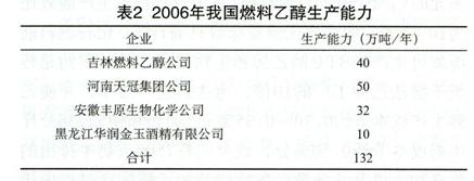 在“十五”期間,我國批準(zhǔn)河南天冠、黑龍江華潤、吉林燃料乙醇和安徽豐原四家企業(yè)加工燃料乙醇,設(shè)計產(chǎn)能為122萬噸/年,到2005年年底總產(chǎn)能己超過設(shè)計產(chǎn)能。到2006年我國燃料乙醇生產(chǎn)能力已達(dá)到132萬噸/年(見表2)。