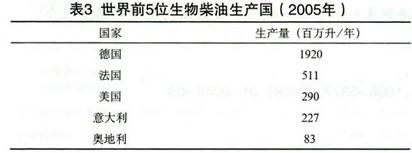 歐盟尤其是德國,主導(dǎo)了世界生物柴油的生產(chǎn)和使用。表3列出世界前5位生物柴油生產(chǎn)國。